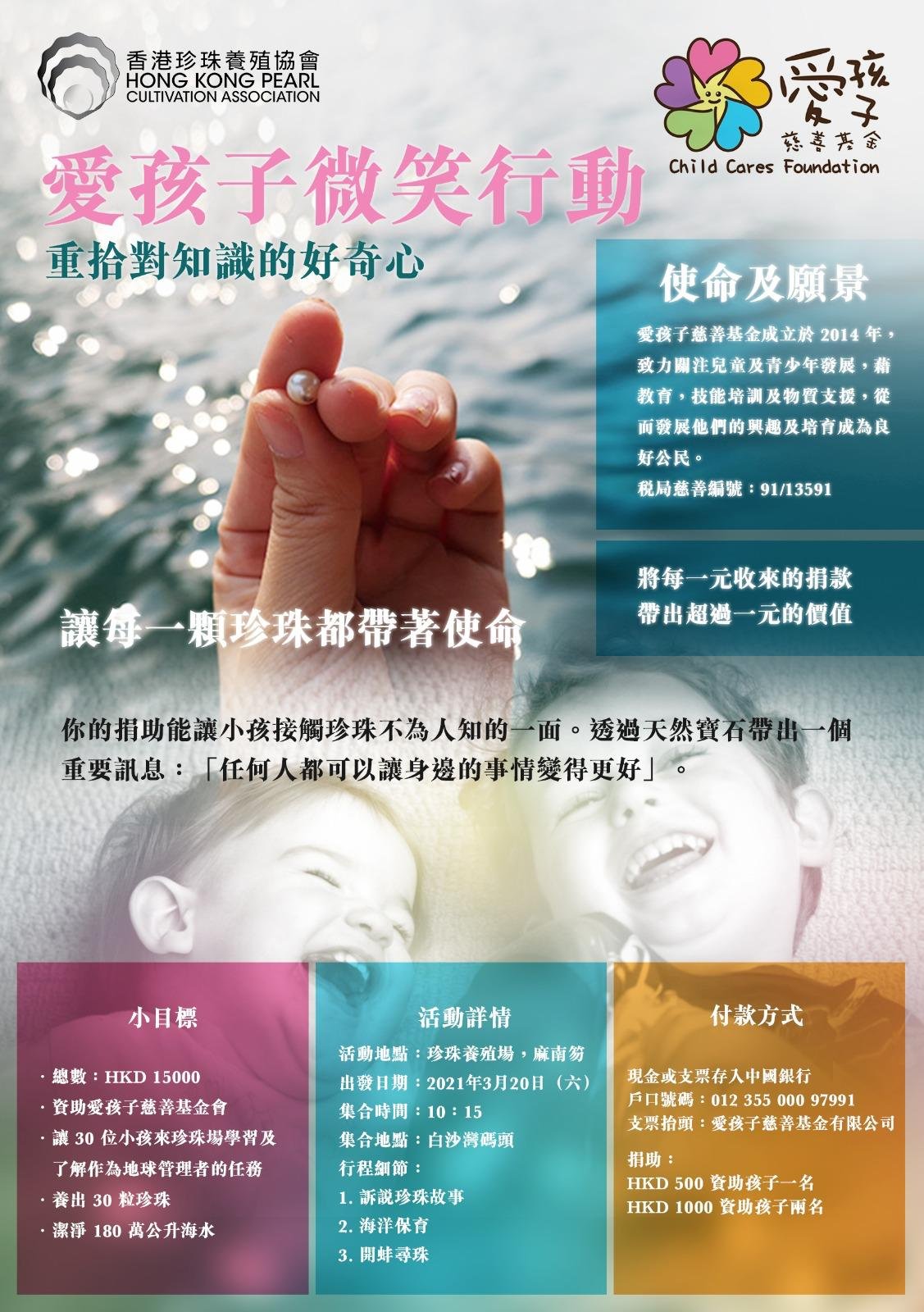 2021年3月20日,愛孩子慈善基金與香港珍珠養殖協會攜手舉辦「微笑行動」,在壟南勞的珍珠養殖場展開一場充滿知識與笑容的探索之旅。活動旨在透過珍珠的故事,喚起孩子們對自然與知識的好奇心,並培養他們對地球管理的責任感。