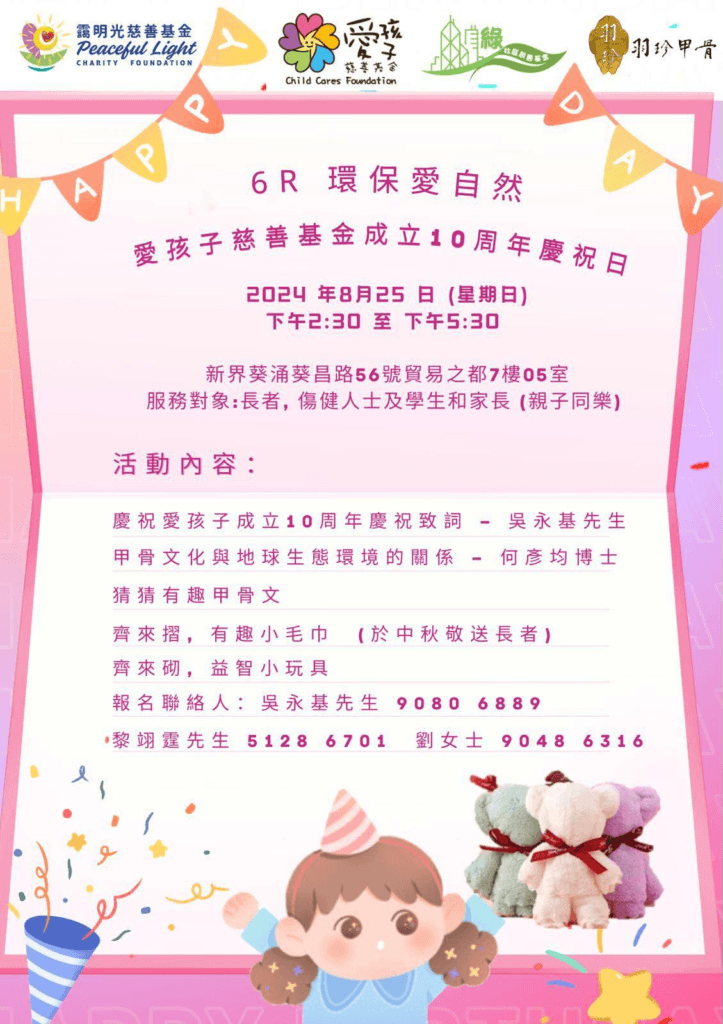 在2024年8月25日這個特別的日子,愛孩子慈善基金舉辦了「6R環保愛自然」活動,與大家一同慶祝我們的第10個
