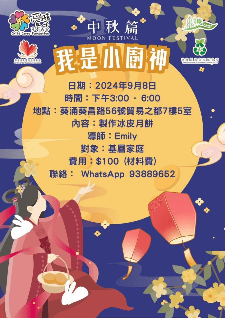 愛孩子慈善基金 x 綠社區慈善基金 於2024年9月8日舉辦了「我是小廚神」中秋篇活動,讓一班基層家庭家長和小